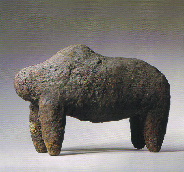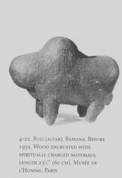 | Zoomorphic shrine object, Bamana; Mali Wood, sacrificial materials, clay; L. 21" Like the mask form, this object can serve as an altarpiece and is kept in a secluded sanctuary. Boli sculpture depicts an animal such as a hippopotamus or cow but in ritual use builds into a dark accumulation of mud and sacrificial materials in which the form becomes ambiguous. Used for the good of the association and community in dispelling evil, it is regarded with fear and loathing by non-initiates in Bamana society. The simple form of this example abstracts the nature of "animal" almost to its limits, depicting the quintessential idea within the image. From the website for the book - Remnants of Ritual - Selections from the Gelbard Collection of African art http://www.remnantsofritual.com/gallery/008.html |