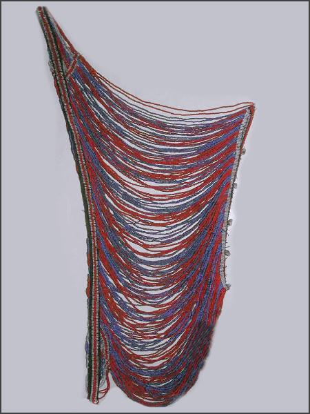 | Malual (male corset) Dinka, Sudan Second half of the 20th century Glass beads, cowries, plant fiber, cloth, iron 90.6cm x 46.5cm (351/2M x 18") CMC-2002.20.2-a/b In the collection of the Canadian Museum of Civilization "The Dinka beaded vest and corset shown in "Beads of Life" were collected in the southern Sudan during the mid-1990s. Ornaments of this type first came to the attention of the general public with Angela Fisher's Africa Adorned (1984), which instantly transformed the Dinka people into an exotic attraction at the very time when the Dinka were suffering from the war in the southern Sudan. Although worn only by the Dinka Bor, they have since acquired emblematic status among some Dinka war refugees, who make woollen versions of the corset and occasionally wear these for dances. These ornaments probably appeared during the second half of the twentieth century as glass beads became available in greater quantities in the southern Sudan. They are apparently "extensions" of formerly existing belts for men and necklaces for women. The male corset is easily recognized by its "horn" (fungi), flinging itself toward the sky at the back of the body. Cowrie shells (gak) are sewn at the front and back of the female vest, probably to protect the wearer and ensure her fertility. Both corset and vest come in different colors, each linked to a particular age group. A man in his early twenties would have worn the corset, and a married woman in her late twenties the vest." From - Beads of Life: Eastern and Southern African Adornments by Mary-Louise Labelle |