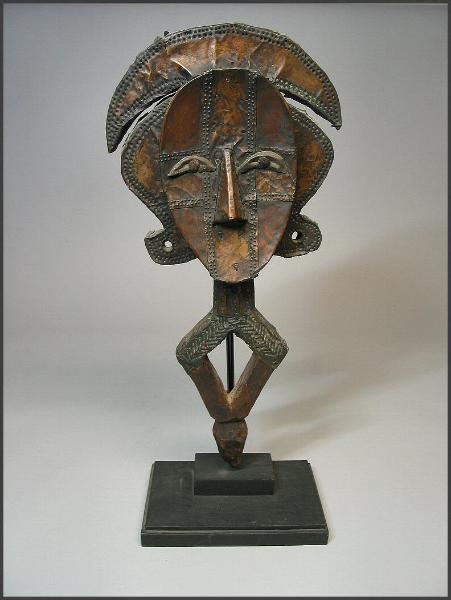 | The Kota live in villages comprising two or more clans. Clans in turn comprise several lineages or family groups that trace their descent from a common lineage ancestor. This is an important point related to their art, for like the Fang, the Kota revere the relics of ancestors. Ancestor worship formed the core of the family group’s religious and social life. At the death of a chief, the initiates would take from the body of the deceased various relics, which were then decorated with metal and rubbed with powders of multiple magical powers. The Kota have produced large quantity of statues of ancestors with the diamond-shaped lower part called mbulu-ngulu; these rather two- dimensional sculptures are in wood; symbolic metals were applied to the upper part in strips or sheets to add power. Copper in particular was identified with longevity and power. These statues stood guard in cylindrical bark boxes, on baskets or bundles called bwete that contained the skulls and bones of important ancestors. Bound into a packet and lashed to the base of a carved figure, the bones formed a stable base that allowed the image to stand more or less upright. Thanks to the diversity of the groups, scattered over a vast area, a great variety of different styles of figures has developed, some of them endogenous and some influenced by neighboring styles. Kota figures represent an extremely stylized human body, reduced to shoulders and “arms,” in emptied lozenge shape, surmounted by a large face framed by an ample coiffure with hanging tresses. The face, always oval, may be concave (female), convex (male) or concave-convex, with a forehead in quarter-sphere (also male). The reliquaries were kept outside the homes, in huts at the edge of the village. Only the initiates of the lineage had access to this sacred place. At the time of initiation in the reliquary cult, the clans would meet to perform communal rituals; each clan’s chief would dance holding the reliquary. Some reliquaries featured a large figure representing the lineage founder along with some smaller figures representing his successors. There are figures with two identical or different faces made on two opposite sides of the flat head. The bwete was called on in time of crisis to combat unseen agents of harm. Its intercession was sought in such vital matters as fertility, success in hunting, and in commercial ventures. A husband could use it to guard against his wife’s infidelity, for it was believed that if he placed pieces of her clothing in the reliquary, an unfaithful wife would be driven mad. Families took their bwete to ceremonies of neighboring villages to strengthen the allied community. The display of the bundles and their shiny, visually riveting figures was accompanied by feasting, dancing, and the making of protective medicines. These bwete were kept for generations, but during the 20th century, when religious beliefs changed, they were abandoned or even destroyed. Source: Robin Poynor - A History of Art in AFrica |