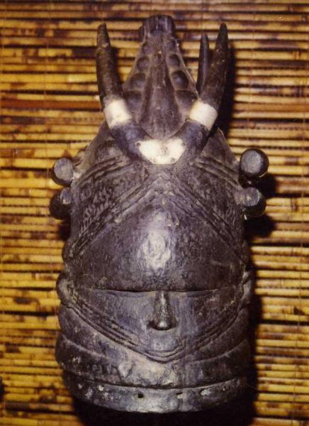 | Sande Society Mask, 16" Mende, Sierra Leone Metal-banded horns adorn this mask shown in 1976 at the Sande masquerade in a village in the Bumpe Chiefdom, Sierra Leone. In figure C we see the costumed dancer in motion during a Sande festival. Some years after that photo was taken, the mask was brought out of its culture of origin into the western art market. As comparison reveals, the Koranic amulet that originally topped the carving is no longer there. Subsequent to the photo, the amulet broke off at the narrowest point in the carving. It is possible that the decision to sell the mask was prompted by this break. |