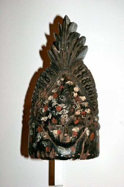| Gonde Mask, 15" Mende, Sierra Leone When a Sande mask became old and eroded, it was sometimes reinvented as Gonde, a character in the coterie of festival dances. Where Sande is sedate and correct, Gonde is the reverse, irreverent and irrascible. The mask is often spotted or painted, contrasting it with the sleek black of the Sande mask. |