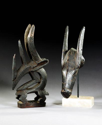 | Sotheby's - New York African, Oceanic and Pre-Columbian Art Auction Date : Nov 11, 2004 Lot 39 : A FINE BAMANA, BOUGOUNI OR DIOÏLA REGION, HEADDRESS Description tji wara, the base pierced for attachment beneath a figure with bent legs and a rounded body with rows of incised motifs folding to a medial ridge, with a small face at the front and a tail at the back surmounted by an openwork mane and gracefully arching head with extended horns and pointed ears with fiber attachments; fine and varied, slightly encrusted deep brown patina. Dimensions height 17 3/4 in. 45cm Estimate:$ 10,000 - $ 15,000 Price Realized: $ 12,000 Provenance PROPERTY FROM A CHICAGO PRIVATE COLLECTION Doctor Gaston Durville, Paris Acquired from Pace Gallery, New York, June 1983 Notes This tji wara represents a composite of the hippotragus antelope and a pangolin. In Bamana mythology, the antelope is the bringer of agrarian knowledge. Likewise, the pangolin, a burrowing animal, knows how to till the soil having witnessed the bringing together of the earth by God (Zahan 1980: 74; quoted in Colleyn 2001: 204). See ibid. 230-233 for related headdresses. |