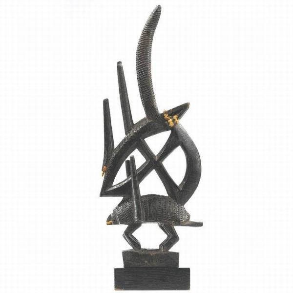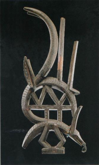 | Abstract Tji wara This headdress represents the comparatively more abstract type of Chi Wara mask; which is found primarily in the Ouassoulou region of the southwestern Bamana area. It shows a typical combination of three different species of animal - the aardvark, the pangolin, and the roan antelope. The base of such headdresses is invariably formed by a representation of the aardvark. Here it is clearly recognizable from the simplified but still relatively naturalistic elongated head, pointed ears, arched body, and bent legs. The structure on the aardvark's back, circumscribed by a nearly closed oval, represents a pangolin in the rolled up position it assumes in defense and to protect its young. This stylized figure is surmounted by two vertical elements and by the horns and long, pointed ears of an antelope. According to Zahan, all three animals are symbolically linked in the Bamana farming community with tilling the soil, including it's sexual connotations. The aardvark and pangolin, especially, are associated with the growth of sorghum, the Bamana's most important grain crop. The aardvark's ability to dig rapidly into the ground and create a network of subterranean tunnels and chambers recalls the men's skill at working the fields, as well as the deep root system formed by the germinating sorghum seeds. The pangolin, in contrast, which lives mostly on the ground and in trees, recalls the windblown stalks of millet, which are stabilized by air-roots anchored in the ground. Sources: A History of Art in Africa and Africa and Africa - The Art of A Continent |