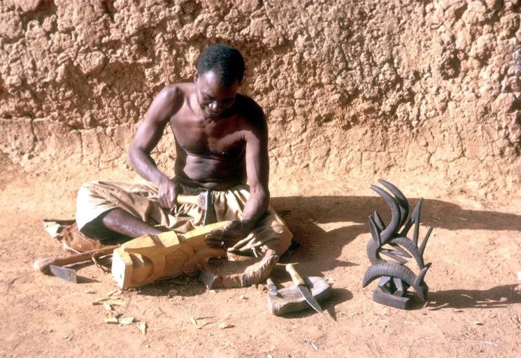 | A Bamana carver making an abstract Tji-Wara Photo source: Eliot Elisofon Photographic Archives |