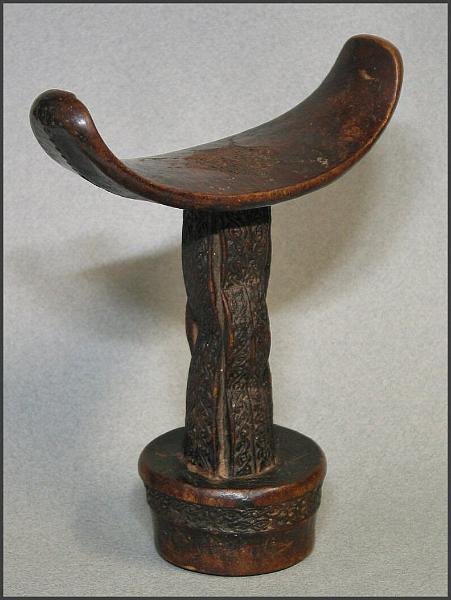 | This headrest has the same stem design as mine does, you just can't see it that well because of the red tassels. Headrest (barkin) Somali peoples Mogadishu, Somalia Late 20th century Wood, plant fiber H x W x D: 21.0 x 16.3 x 7.3 cm (8 1/4 x 6 7/16 x 2 7/8 in.) Gift of the Loughrans This object is in the collection of the National Museum of African Art, 76-16-13 This type of man's headrest is one of two types used by Somali nomads. Where both forms are used, the single support is generally for men of lesser status than those who use the double-support type. The small, easily unbalanced base has made the headrest an emblem of alertness and the ability to wake to action. Made of sturdy but relatively light wood, the headrests are used on beds and are also carried by herdsmen who use them to rest while keeping an eye on their herds. They may be carved by the owner or commissioned from an artist. The inscribed interlace patterns reflect the influence of Islamic graphic design in the region. |