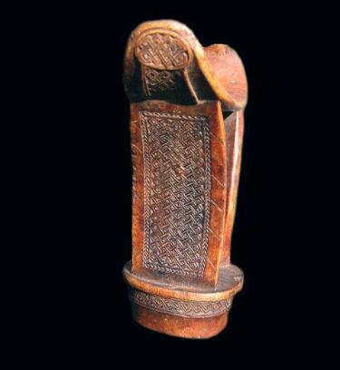 | Headrest (barkin) from the Boni or Somali people of Somalia Men in East Africa use headrests both as pillows and as indicators of status. This type of man's headrest is used by the Boni of northeastern Kenya and southern Somalia and by Somali nomads. Men's headrests generally feature a smaller base that makes them somewhat unstable to sleep on, while the rectangular bases of women's headrests are usually more stable. The small, easily unbalanced base has made the headrest an emblem of alertness and the ability to wake to action. Made of sturdy but relatively light wood, the headrests are used on beds and are carried by herdsmen, who also use them to rest while keeping an eye on their herds. Boni shepherds rest while standing on a single leg, with their head lying on the neckrest set on their shoulder. These neckrests symbolize vigilance because since their base is so small, the resting person could not fall asleep without falling over. The patterns on Somali and Boni headrests probably reflect the Islamic influence in the region. Some scholars interpret the patterns and iconography as a "form of shorthand for a prayer," to ensure God's protection of the sleeper. Headrests also play an important role in the nuptial ceremonies of Somali nomads. On his wedding night, the groom places the tubash (a sum of money) under the bride's headrest. The morning after the marriage is consummated, the bride will use this money to purchase an amber necklace, the symbol of her new status. The headrests are carved from a single piece of fine-grained wood known as hagar in Somali, or also yucub wood. The wood is usually left its natural color, but is sometimes painted red or black by its owner. They may be carved by the owner or commissioned from an artist. Somali and Boni nomads make use of two types of headrests; one with a single cylindrical supporting column and one with a double column. It appears that the different styles are for men of different status, with the single-columned variety for young men and the double-columned variety reserved for elders. The more elaborate the headrest is, the higher the status is of its owner. Boni headrest from Somalia References- National Museum of African Art and Metropolitan Museum of Art |