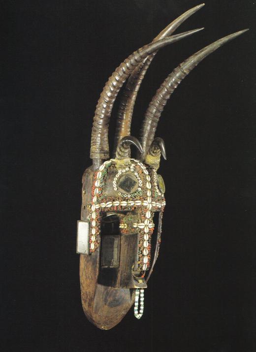 | MASK (KIWARANI) Mali, Bozo, Kita region Wood, shells, mirror, seeds, beads H. 73 cm. Dakar-Djibouti expedition 1931-1933 The mask in the photo above is in the Musee de I'Homme IN the journal of the Dakar-Djibouti expedition, published in 1934 under the title I'Afrique Fantome, Michel Leiris stated that this mask and two others were bought at a dance organized by the colonial administration for the celebration of Bastille Day on July 14, 1931. "Men wearing antelope masks having five horns and six mirrored eyes danced with others who were entirely costumed and whose hoods had a long tuft of porcupine quills in place of a nose." Leiris was told that this type of mask was invented by a blacksmith (noumou) named Tamba who lived in the village of Kolena. According to a tradition relating to the Emperor Soundyata Keyta, this mask would first have been carved in the image of a woman, who then changed herself into an antelope, and then into a porcupine. Elsewhere, Leiris was told that these Malinke masks, like Bamana antelope crests, were linked to agricultural rites and were worn to encourage farmers in their work. To our knowledge, the Musee de I'Homme is the only museum that owns masks such as these from the eastern border of Mali, a region from which very few sculptures are known. This scarcity is explained by the almost total Islamization of the region at the end of the nineteenth century. The users of these masks never mentioned their functions to the expedition members, except for a vague entertainment purpose. If the masking societies still existed in 1931, their activity was kept secret. The sophistication and richness of the colored decoration leads one to think that the blacksmith-sculptor who made them worked for a society that was still very active and which took care to call upon a renowned sculptor. In spite of Leiris' efforts, he never succeeded in meeting Tamba. Source: Masterpieces from the Musee de l'Homme |