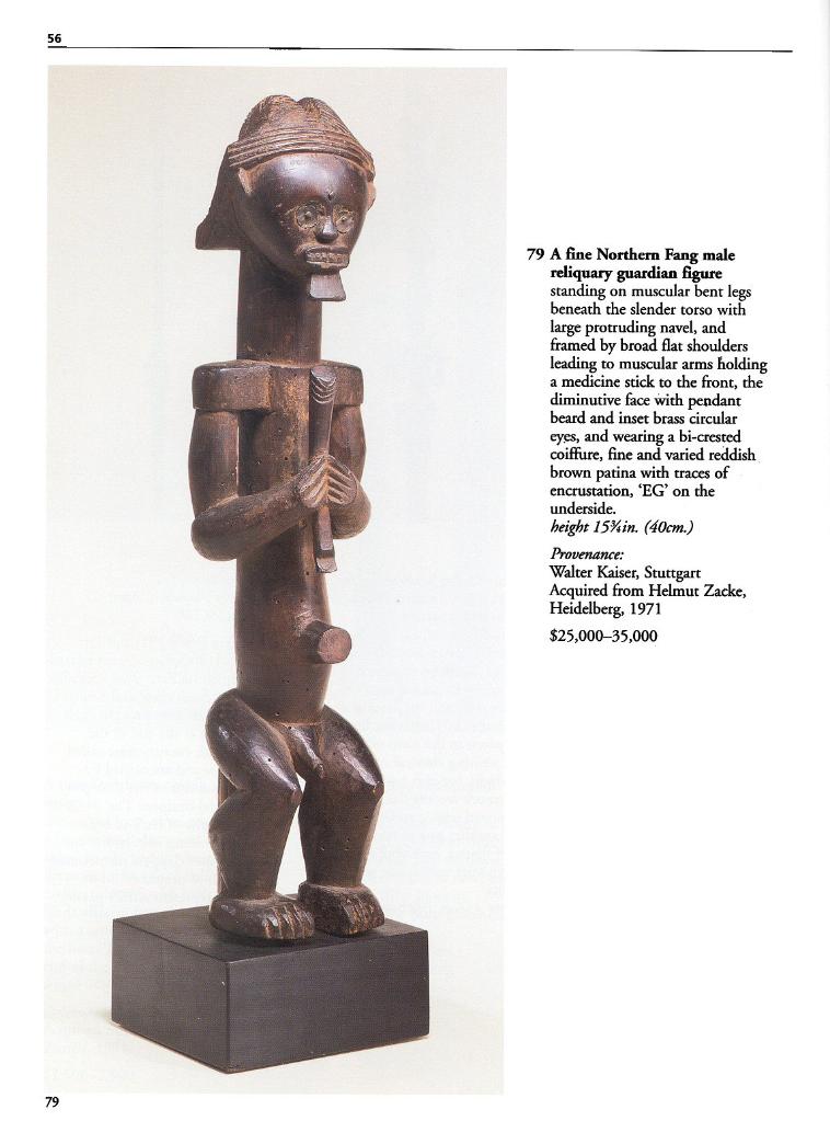 | The Fang piece we have been talking about is a piece that was auctioned off at Sotheby's in November of 2000. As you can see there is not much information regarding the estimated age or collection date, it only states that the piece was acquired from Helmut Zacke in 1971. I did the original posting on this piece as a hopeful learning experience for the group. I wanted to pick a figure that had been at a major auction house and a piece that hopefully was not all that well known. I picked a piece that had some stylistic differences than some of the other Fang pieces. The piece sold at auction in 2000 at Sotheby's for over $81,000 USD. It must mean that it's a good piece and that it's authentic. I know that it's hard to judge a piece from a picture, but that is the only medium available to us in this group usually. I was curious as to how many people would speak of this piece as an outright fake or if someone would actually see that it had value. The interactions were interesting and I hope that it was a good learning experience for all. I love the interaction that is available in the group, I don't have much African Art interaction besides what I get in the group so I do value it. Maybe the next time someone posts a picture about an item, we can all think back to the picture below and give the item in question a little slack. The item in question may be a fake or it may not be a fake, it is hard to tell from a picture sometimes, especially if the picture is not of that great of quality. At times I wish that we all could get together someday and have some sort of a workshop, listen to people speak, handle old pieces that have had traditional use and have an old original patina and compare pieces from the same tribes with stylistic differences. Face to face learning experiences. Until that day I will enjoy the interactions of the group. African Art in many regards is truly complex... but in other ways it is also truly simple and wonderful. |
