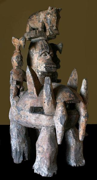 | Iphri works of art evoke the aggressive energy essential to the ideal Urhobo male personality. In the old days, iphri owners were excellent hunters and, when necessary to defend their families, formidable warriors. They remain well recognized as forceful, dramatic public speakers. An iphri takes the form of a fantastic four-legged beast with multiple layers of teeth. Rising out of its top is an image of the owner of the form. In some cases he seems to be riding the beast; in other cases, the beast seems to be part of his torso. Sometimes he appears with family members flanking him. Iphri ownership is declining today, but at one time a warrior or hunter would have maintained an iphri; even now, a man who has trouble controlling his temper may keep one, as might a man who consistently loses property. A small child who is always tempestuous may be given a tiny iphri to wear around his neck. Certain men who have too much aggression are said to "need iphri." They are often the community's most aggressive individuals, unable to control an overly forceful outlook on life. Iphri, then, have the apparently contradictory function of increasing aggressiveness for those who have too little, and controlling it for those who have too much. An iphri may be carved in many different shapes and its size reflects the social stature of its owner. Prayer to the image, and the actual act of feeding the mouth of the iphri, provide the owner with a more balanced personality. The iphri shrines exhibited in this section demonstrate the extraordinary artistic variety of the iphri genre, and related works from neighboring areas show its strong artistic links to related styles throughout the western Niger Delta. Iphri tore! (Iphri-the-roaster!) Sa iphri! (Iphri-go-on-the-attack!) Edion! (For the good of all!) -- Praise poetry for iphri, by Meriore Arhirhe Edjekota, September 15, 1971 Akanabe is respected for his strength; if he does not stand up to his name, it will be his shame. The time has come for a day to be fixed for battle. My people have made me their leader, and my heart keeps its calm. I hold clubs to my chest on my way to the battlefield. -- Tanure Ojaide Poetry, Performance, and Art: Udje Dance Songs of the Urhobo People, 2003 From: Where Gods and Mortals Meet - Continuity and Renewal in Urhobo Art |