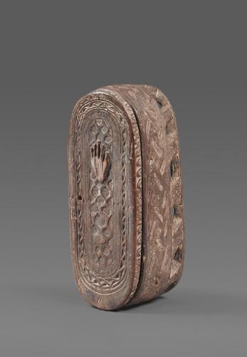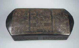 | 291 Box for camwood powder estimate 450 euros Box for camwood powder wood, blackish patina, of rectangular form, curved at the narrow sides, a slightly vaulted lid with elaborately carved rhombic ornaments, slightly dam. L: 24 x 11,5 cm; H: 7,5 cm (4170/10) from: http://www.tribal-art-auktion.de/Katalog-0-Inhalt.pdf |