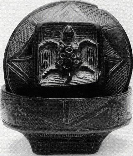 | Sotheby's London 1987 lot 261 A Kuba Wood Box, of circular section, entirely covered with patterns of geometric designs, a turtle carved at the top of the lid, the whole with a very fine shiny patina, 17cm./6 3/4in. diameter estimate £800-1,200 |