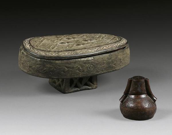 | Sotheby's - Paris Art Africain et Océanien, African and Oceanic Sale Auction Date : Dec 5, 2003 Lot 198 : f - UNE RARE BOÎTE À POUDRE COSMÉTIQUE SUR PIED ET UNE BOÎTE À PRISER, KUBA, RÉPUBLIQUE Description f - UNE RARE BOÎTE À POUDRE COSMÉTIQUE SUR PIED ET UNE BOÎTE À PRISER, KUBA, RÉPUBLIQUE DÉMOCRATIQUE DU CONGO QUANTITY 2 a. La boîte à cosmétique de forme oblongue, supportée par un pied rectangulaire à motifs ajourés, est entièrement ornée d'un décor géométrique gravé. L'intérieur a conservé les traces de la poudre cosmétique rouge tool qu'elle servait à contenir et dont les femmes et les hommes se paraient le corps. Facture ancienne. Fentes sur les côtés. b. La boîte à priser offre une forme et un décor gravé d'un très grand raffinement. Dimensions a. long. 30 cm - b. haut. 10 cm Estimate: Price Realized:€ 1,000 - € 1,300 $ 1,446 € 1,200 Provenance THE PETER SCHNELL COLLECTION L. Bretschneider, Munich, 1961 Maria Wyss, Bâle, 1971 |