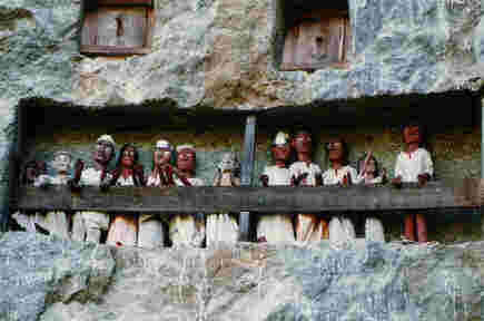 | "LEMO" stone grave in Toraja - South Sulawesi At LEMO stone grave of Torajan, you can see the "tau-tau" balcony, one with the steep line-stone museum in the open nature, a combination of death, art and ritual. "Tau-Tau" or wooden effigies which means small people or man-like statue that is considered to be the spirit of the deceased made out of wood or bamboo. When the clothes of the effigies worn out by sun, wind or rain, they can be changed periodically on the certain time which should be held with a ceremony called "Ma'nene" ( to honour the parents ). Source: www.nelltours.com |