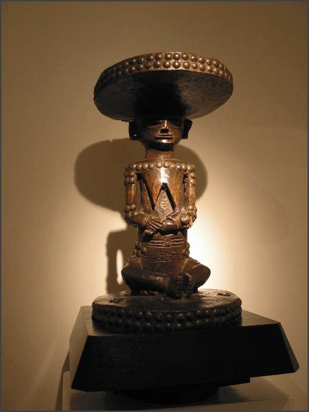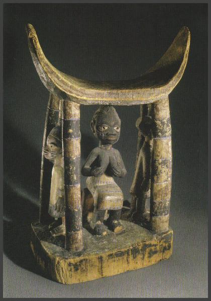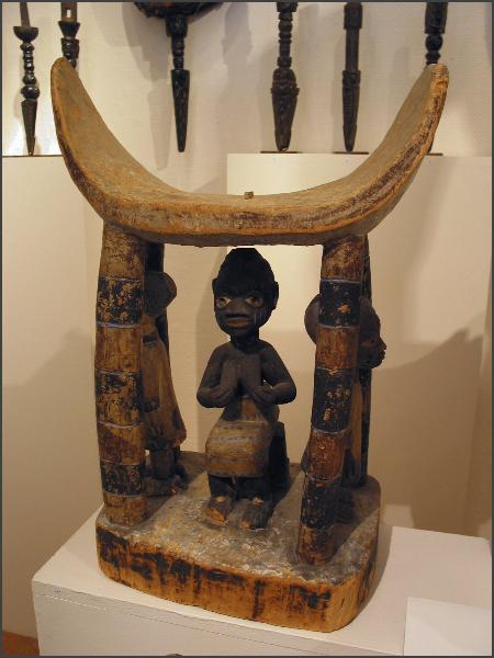| Next was #2, AEthiopia "For KAOS Parcours des Mondes 2006, Agnes Woliner has brought together three themed collections: a group of shaman drums from Nepal, a group of toggles that, just like Japanese netsuke, were used to attach medicine boxes, or other small accessories to belts, and a carefully selected collection of headdresses from Africa, Oceania and Southeast Asia." My favorite thing in her gallery was the Yoruba stool that was featured in the event catalog shown below. |
