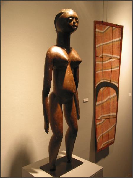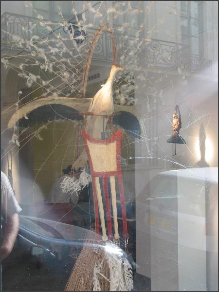 | Next down the road is #3, African Muse Gallery (photos below) "Berthier's African Muse Gallery, the specialist Parisian gallery for Australian aboriginal painting and the arts premiers. As the quai Branly Museum opens its doors to the public, it is with great pleasure that Luc Berthier sees the consecration by a major cultural institution of his initial project: the definitive integration of the Australian aborigines to the realm of the arts premiers. For KAOS 2006, the African Muse Gallery brings together painted barks by John Mawurundjal and northern Australian artist Kay Lindjuwanga, alongside paintings by Lorna Fencer Narpurrula (Lajamanu region) and the greatly missed Minnie Pwerle (Utopia region). An exceptional group of statues and masks from Africa (of which a Bamana lion mask, also a female statue from the Cross River, Anyang cult, Nigeria) and from Nepal (notably a spectacular shamanic statue, remarkable both by its size and rarity) will be presented at this occasion. In parallel, on the right bank of the Seine, at 50, rue de I'Hotel de Ville, Luc Berthier will be showing sculptures and drawings by contemporary Dogon artist Amahiguere Dolo, in the exhibition "The day after Kaos" from September 15th through to October 14th." I was curious to see this gallery because on of my Lobi figures came from this gallery in the 70's. Most of the art they had on display were Aboriginal paintings and they had a few African objects mixed in, but to me it was a strange group of objects. The figure they featured in the event catalog was nice though. It was listed as an "Anyiang figure from Nigeria" |