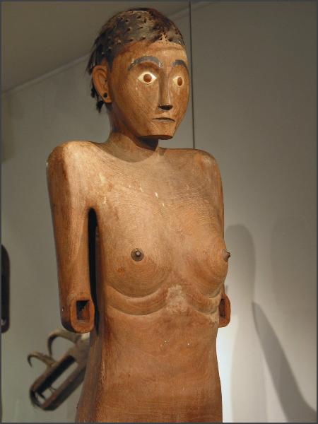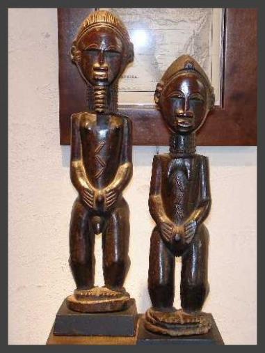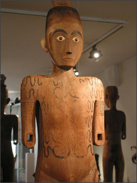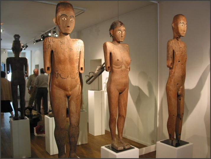 | Across the street was #47, Serge Schoffel When you walk into the gallery you are immediately drawn to a group of 3 objects in the back of the gallery. They have the commanding presence in the room by far. They are a group of 3 "Tau Tau" figures from the Sa'dan Toraja people of Indonesia. I've only seen them in books and it was a treat to see them in person. They are funerary figures that are carved to represent the dead person. They are usually clothed and placed in a small sort of a terrace near the village, see the photo underneath the figures to see what I'm talking about. The 2 on the left were supposedly a pair. I think they were selling these figures individually and it would be a huge shame to break up a couple if that were indeed true. |