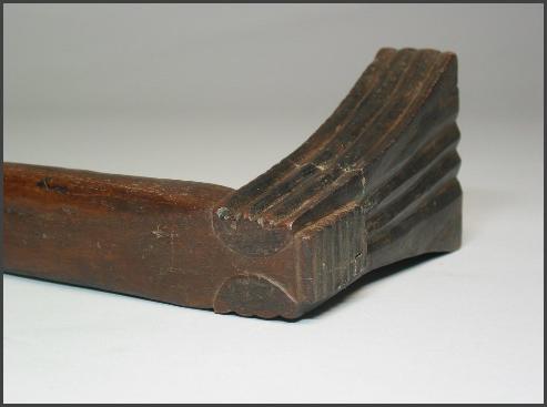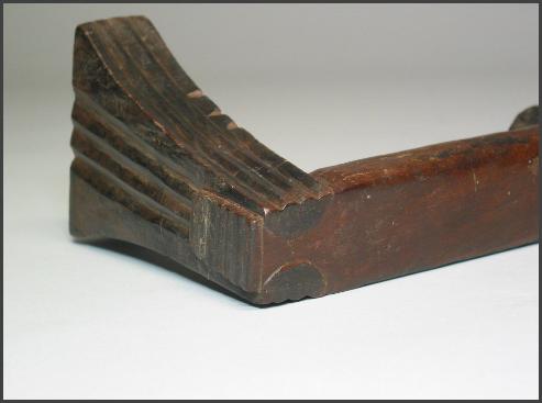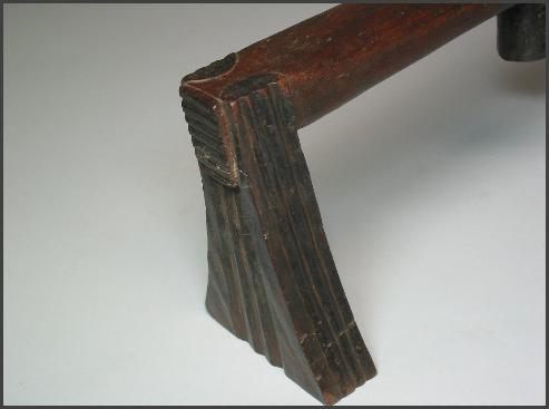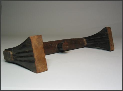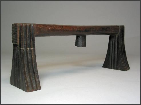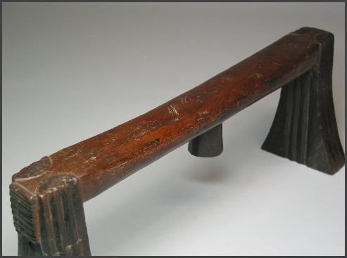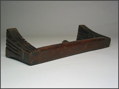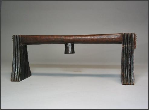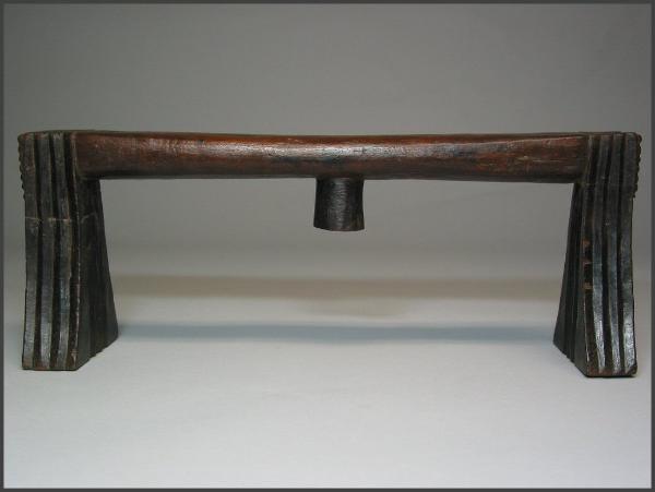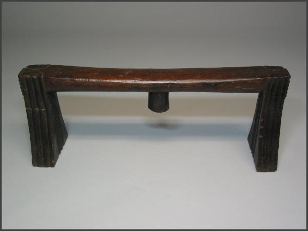 | Swazi headrest 17 inches long by 6 inches tall Wood, pigment Acquired from Gordon Crawford - field collected by Gordon Crawford in the northern Hho Hho region in Swaziland Swazi headrests are very similar in style to their neighbors the Zulu. Swazi headrests are usually 2 legs on either end that are commonly darker than the cross bar they support. The crossbar usually contains a lug pendant found in the center of the underside of this crossbar. The legs appear to be almost invariably fluted with vertical grooves, and in some examples, tails and leg-like forms are added at the short end of the headrest. There is no specific research known to have been done on Swazi headrest symbolism and usage, it is usually assumed that they must have followed a pattern similar to their southern neighbors, the Zulu, with whom they share many cultural patterns. Headrests such as this are often damaged from being used as candle holders, or often broken and discarded from general use. Often times they are buried with their owners which is a practice done among many cultures in Southern Africa. References: Sleeping Beauties |