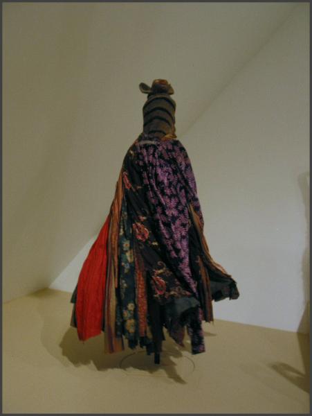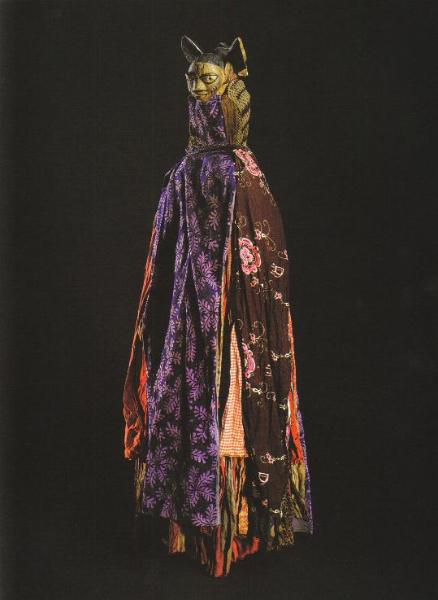 | Egungun mask and costume. Egba Yoruba; Abeokuta, Nigeria. Wood, pigment, fabric; 1.5m (61"). 1997.154. Gift of Michael and Patricia Coronel and the Native Arts Acquisition Fund. Photo on right - Denver Art Museum "Families of the Egungun society honor their ancestors, specifically the ongoing presence and power of the deceased, by sponsoring and performing annual and biennial masquerades. This mask is notable for its Janus aspect: a white human face with vertical cheek marks is juxtaposed with a red human face with "hare" ears (visible behind the facing head), a conical head projection, and horizontal cheek marks. Gelede societies west of Abeokuta consider the hare or rabbit to be a nocturnal creature and therefore associated with witches." They had this mask and costume mounted on a rotating pole so you could see it from all angles and "in motion" as it would have originally been. |