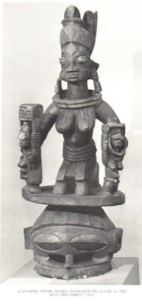 | Epa mask, Yoruba Nigeria, Osamuko of Osi village ca 1920 wood, red pigment 112cm (Right - DAM photo) |