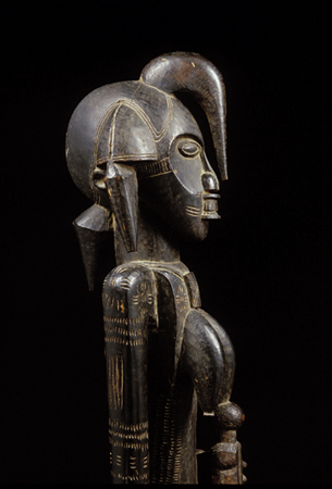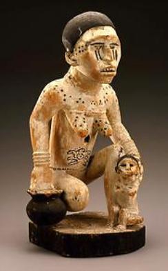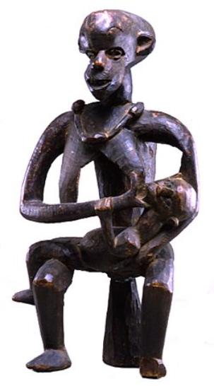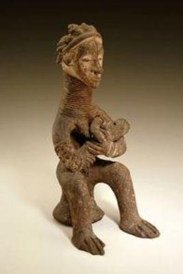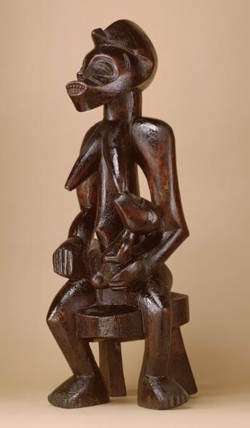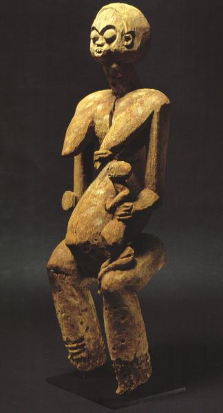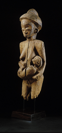 | Maternity Figure, 19th–20th century Senufo peoples; Côte d'Ivoire Wood, oil patina; H. 21 1/4 in. (54 cm) Gift of Lawrence Gussman, 1981 (1981.397) Metropolitan Museum of Art, NY This impressive representation depicts a mother nursing an infant. The sculpture is used to honor women and their maternal role in ceremonies and festivals of the tyekpa society, a social association among the Senufo peoples. The delicate infant strains at his mother's breast intently focused on its vital nourishment, while his mother remains stoic, steadying the baby in her left arm. The head of the mother is rendered in a rather expressionistic fashion, with pronounced mouth, large eyes, and crestlike coiffure. Her slit eyes suggest a sense of introspection and serenity as she fulfills her maternal obligations. The mother's face is further adorned with fine linear incising on the temples and cheeks, marks that are analogous to those made on Senufo women after having reached puberty. The surface of the figure is finished in a lustrous sticky patina, indicating the frequent application of oils as spiritual libations, but also to preserve the piece. The tyekpa association functions in Senufo culture primarily as a funerary society. This sculpture is but one element of complex funerary celebrations that also include music, song, and dance. These elements come together to pay homage to and honor the memory of an elder tyekpa "mother." During the ceremonies, tyekpa members dance with various figurative sculptures such as this mother-child pairing raised high above their head. Due to its prominent visual display in the funerary proceedings, tyekpa figurative sculptures are rather large, some measuring three to four feet in height; this piece is nearly two feet tall. The Senufo peoples form a complex network comprising more than thirty subgroups with many local variations of language and custom. They occupy a large area of West Africa that spans the national boundaries of Côte d'Ivoire, Mali, and Burkina Faso. Senufo society is patriarchal; inheritance, however, is traced through the matrilineal line. Consequently, the primacy placed on women and their essential maternal role is often reflected in Senufo artistic traditions like this sculpture. The tyekpa association is part of a larger social organization among the Senufo known as Sandogo. Membership in Sandogo is limited to female members of the Senufo community. Senufo life revolves around the Sandogo society and its counterpart, the all-male Poro society. These institutions cut across kinship lines and household ties, creating a social cohesiveness that extends throughout the community. Source: Metropolitan Museum of Art |