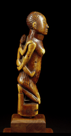 | Yaka peoples Democratic Republic of the Congo Late 19th-early 20th century Wood H x W x D: 27 x 9.5 x 7.6 cm (10 5/8 x 3 3/4 x 3 in.) Gift of Ruth Lippman in memory of Abbott Lippman National Museum of African Art This figure's naturalism and smooth surface are traits found in the sculpture from the Kwango River region. Among the Yaka, maternity figures are rare. They may appear, however, as figures surmounting masks worn by officials at boys initiation ceremonies. |