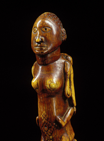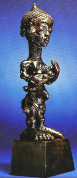 | The Kongo Kingdom flourished from c. 1300 to the mid-seventeenth century. The Kongo were the first people of Central Africa to make contact with the Portuguese navigators, who first arrived in 1482 and brought with them Catholic missionaries, merchants, and artisans. The Kongo aristocracy embraced Christianity and Western culture, and trade with Portugal resulted in increased wealth and military power. From the capital at Sao Salvador in present-day Angola, Kongo rule extended into portions of Zaire, Congo, Cabinda, and numerous small coastal and inland chiefdoms in Angola. Around the mid- seventeenth century, the once-powerful kingdom began to founder and shrink. Finally, it collapsed and became decentralized. Among the symbols of rank belonging to Kongo kings and chiefs were scepters (mvuala) made of hardwood and usually topped by an ancestor figure carved of precious ivory. Very often the ancestor so represented was a female (Cornet 1971, 48). Because power was transmitted through the female line, rulers were selected from among the matrilineage. The king's mother was titled the "queen mother," and although she did not share rule with her son, she held a position of respect and privilege (Murdock 1959, 2.97). Although the precise meaning of this Yombe mother-and-child figure is not known, it probably symbolizes woman as the source of human fertility and the bearer of healthy children—in this case, healthy future rulers. Clearly this mother belongs to the ruling class, as indicated by her cap ("chief's hat") and carefully coiffed hair, filed teeth, and jewelry. A similar cap is worn by the infant, who, as real babies do, holds his mother's breast with one hand and tugs on her hair with the other. Despite the submissive pose, Kongo women were powerful, and images like this are a reminder of their importance. |