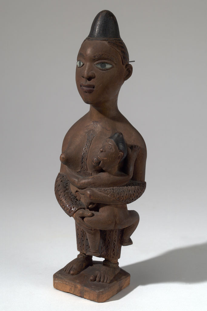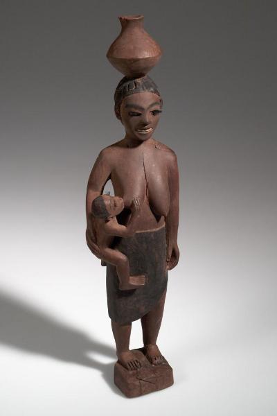 | Female figure with child Kongo peoples Congo, Cabinda Province, Angola, Mayombe region, Democratic Republic of the Congo Late 19th-early 20th century Wood, pigment, mirror glass H x W x D: 54.0 x 27.9 x 26.4 cm (21 1/4 x 11 x 10 3/8 in.) Gift of the Eugene and Agnes E. Meyer Foundation National Museum of African Art |