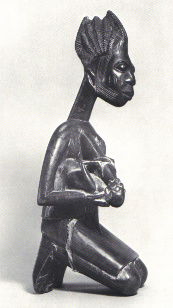 | MATERNITY FIGURE Yoruba peoples, Nigeria, 19th—20th century Wood H. 16 3/4 in. (42. 5 cm) Collection of Rita and John Grunwald According to Yoruba belief, children are blessings from the gods. Before the advent of modern medicine, women petitioned certain deities for fertility and the birth of a healthy infant. The shrines to these deities—Erinle, Yemoja, Shango, Ogun, and others— were adorned with sculptured figures representing a mother and child, as exemplified by this figure. The absence of cult attributes makes specific identification of this figure impossible. The kneeling position is a gesture of respect, devotion, and submission. Thus the figure represented in the carving is probably a petitioner rather than a deity. The sculpture may have been a votive offering from a woman who had successfully petitioned for a child, a priest or priestess of a cult, or even the entire body of worshipers (Bascom 1969b 107; Cole 1985). |