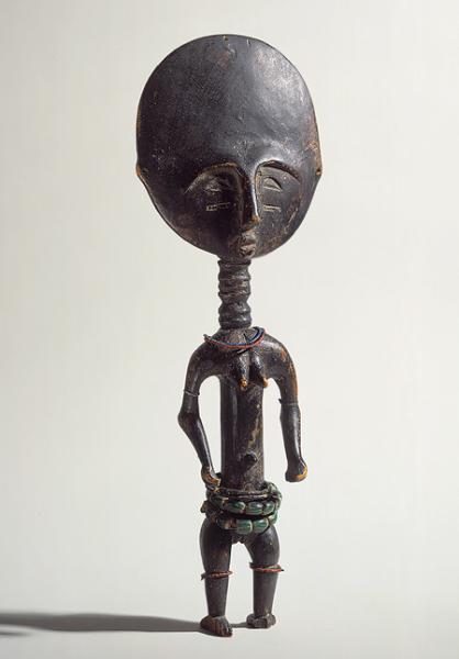 | Akuaba Figure, 19th–20th century Akan peoples; Ghana Wood, beads, string; H. 10 2/3 in. The Michael C. Rockefeller Memorial Collection, Bequest of Nelson A. Rockefeller, 1979 (1979.206.75) Metropolitan Museum of Art, NY Akua'maa (sing., akua'ba) are sculptured wooden figures that are believed to induce pregnancy and ensure a safe delivery and a beautiful, healthy infant. After the akua'ba is blessed by the fertility deity in rites conducted by a priest, the woman carries it and treats it like a real child; she adorns it with beads and earrings, "nurses" it, and puts it to bed. After a successful birth, a mother may give the akua'ba to a daughter to play with or use it to teach child care (Cole and Ross 1977, 103—7; McLeod 1981a, 161-65). Females are, with rare exceptions, the only sex represented in akua'maa. There are several reasons for this, but the essential one is that Asante society is matrilineal and the family line is passed from the mother to the daughters, not from the father to the sons (McLeod 19813, 19, 164). Thus it is essential that a woman have daughters to perpetuate the family line, and it is desirable to have daughters to help with household chores and take care of younger siblings. Akua'maa illustrate Asante concepts of beauty: a high oval, flattened forehead that in reality is achieved by massaging an infant's soft skull; a small mouth; and a neck ringed to depict creases caused by subcutaneous fat, indicating the good health of the infant. In contrast to typical akua'maa, which have truncated bodies, this akua'ba has naturalistic arms and legs. It has been estimated that such figures constitute less than 1 percent of the total number of akua'maa and may be a twentieth-century innovation (Cole and Ross 1977, 105). |