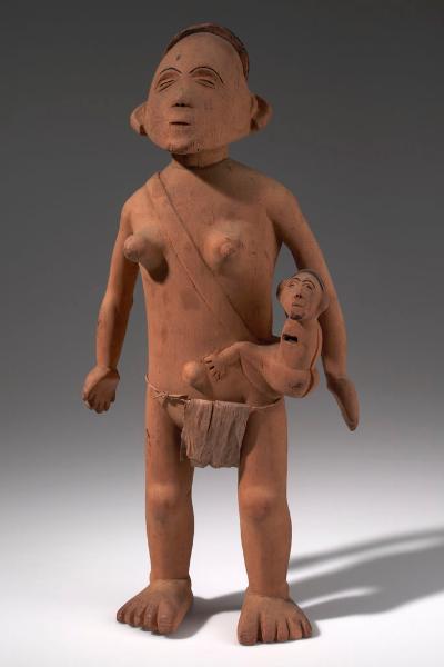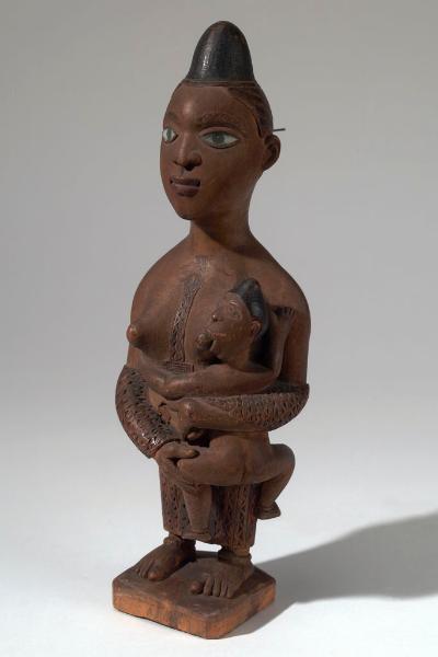| Igbo peoples Nigeria Early-mid 20th century Ceramic, pigment, kaolin H x W x D: 34 x 14 x 18 cm (13 3/8 x 5 1/2 x 7 1/16 in.) National Museum of African Art Woman-and-child figures are placed in shrines and used by diviners in northeastern Igboland, Nigeria. The woman's coiffure, facial expression, striated neck and bracelets with cowrie shells express traditional notions of beauty. |