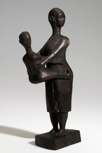 | Kneeling Mother and Child late 19th century Africa, Tanzania-Mozambique border area Makonde peoples Wood 14-1/2 x 5-3/8 x 4-3/4 in. (36.8 x 13.6 x 12.0 cm) Acquired in 1979 Kimbell Art Museum Among the few East African peoples who made sculptures in any quantity, the Makonde are notable for their unusually naturalistic figures. Most African mother and child sculptures are intended to ensure fertility, but this piece indicates the high status of the female in that matriarchal society. It is thought to represent the primeval matriarch who founded the Makonde tribe. Details of the vigorously carved sculpture are sensitively articulated, including the mother's hooded eyes and her fingers holding the sling in which the baby straddles her back, its tiny feet and hands extended. The sculpture displays Makonde signs of feminine beauty, such as facial scarification, prominent breasts, and an upper lip distended by a lip plug. Provenance History Pitt Rivers collection, England. Armand P. Arman (born 1928), Paris and New York, to c. 1977; purchased by (Ben Heller, Inc., New York), 1977; purchased by Kimbell Art Foundation, Fort Worth, 1979. |