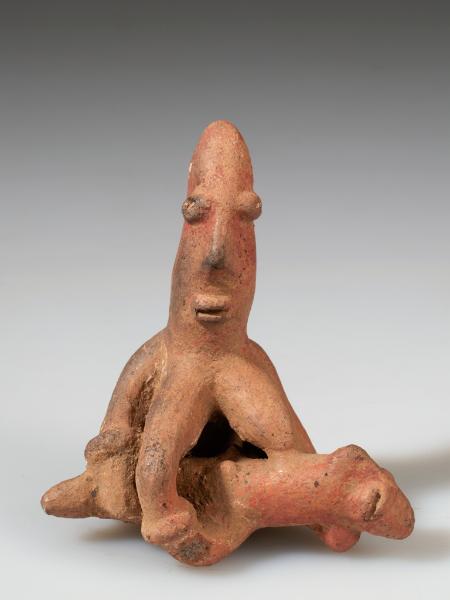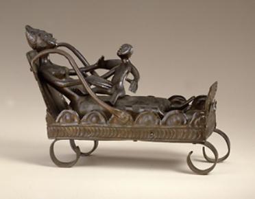 | Fon peoples Abomey, Benin Early-mid 20th century Copper alloy H x W x D: 10.5 x 15.5 x 7.5 cm (4 1/8 x 6 1/8 x 2 15/16 in.) Gift of Ernst Anspach National Museum of African Art This figure appears to be in the style of the Hontondji lineage--the somewhat elongated figures, their relatively large hands and feet and the abundance of tooled detail. According to oral tradition, this style was introduced by a smith named Gnassounou. He was part of the 1906 Colonial Exposition in Marseille and remained in France to study for three years. The style was well established by 1922 when the Merwart Collection was exhibited and continues to the present day. (Emile Merwart was the colonial governor of Dahomey in 1911-12.) These figures were purchased by European curiosity seekers originally. According to anthropologist Melville Herskovits, well-to-do Fon were also buying genre scenes as signs of prestige by 1930. Preliminary stylistic analysis suggests that this figure dates from the 1930s or earlier. |