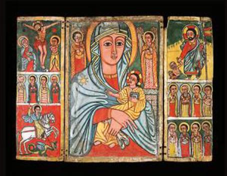 | Ethiopian Orthodox Ethiopia ca. 1750-1855 Distemper, gesso and cloth on wood H x W x D: 34.2 x 47 x 17 cm (13 7/16 x 18 1/2 x 6 11/16 in.) Gift of Ciro R. Taddeo National Museum of African Art The rich colors, especially the green and deep blue, are typical of this time period in Ethiopian icon painting. The emphasis on Mary's hand gesture, the Christ child's book and the shawl's decorative folds and star and cross ornaments derive from a Jesuit copy of an Italian engraving of a Santa Maria Maggiore icon. Mary's handkerchief, however, is an Ethiopian status symbol. Left panel top: "St. Mary," "Our God is crucified," and "St. John" the Evangelist middle: Four apostles or saints bottom: "St. George" and the dragon Center panel "St. Mary with Her Beloved Son" flanked by the archangels "St. Michael" (left) and "St. Gabriel" (right) Right panel top: "Painting of Resurrection" (the Descent into Limbo), "Adam and Eve" middle: Four apostles or saints bottom: Four apostles or saints |
