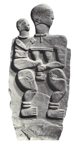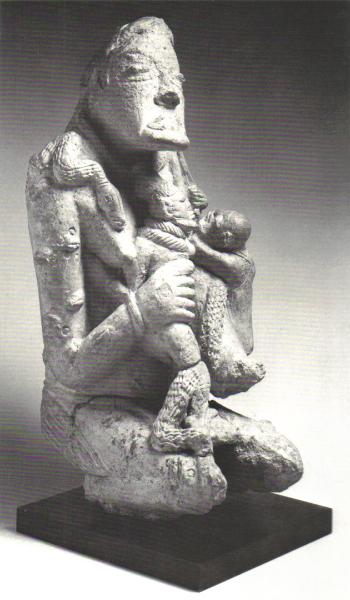 | MATERNITY FIGURE Inland delta region of the Niger River, Mali late12th-late 14th century Terra-cotta H. 15 1/8 in. (38.4 cm) Collection of Count Baudouin de Grunne, Belgium Since the 19405, the excavations in the inland delta region of the Niger River near Djenne in Mali have yielded numerous sculptured terra-cotta, cast copper-alloy, and gold figures representing humans and animals. These sculptures originated in advanced, flourishing cultures that may have existed as early as the eighth century A.D. or as late as the seventeenth century. Figures representing a mother and child seem to occur less frequently than other subjects, such as chiefs or warriors on horseback, reclining or kneeling females, or animals, especially snakes. The meaning of these ancient maternity figures is unknown. In this example and in other instances, the "children" are obviously mature adults, as indicated by the beard on one of the males in this figure. Perhaps such figures served as symbols of the primordial mother or another mythical figure in the history of a clan in which the sculpture originated. Regrettably, the stratigraphic context in which most of these objects have been discovered and other pertinent data are unknown. Even so, it is possible to date the objects. In 1979 this figure was dated by the thermolumines-cence method to 690 ± 105 years earlier (de Grunne 1980, 2.7, fig. 1.15). The proliferation of decorative details on the figure includes serpents, which are depicted as zigzags. Snakes commonly occur in the visual arts as well as in the oral traditions of numerous peoples of the inland delta region. Snakes play an important role in the cosmology and mythical origins of the clan. For example, snakes are king makers, designating the successful candidate by touching him with the nose (ibid., 17-35). Snakes are often considered to be symbols of immortality throughout sub-Saharan Africa because they "renew" themselves by shedding their skin (Parrinder 1954, 51). |