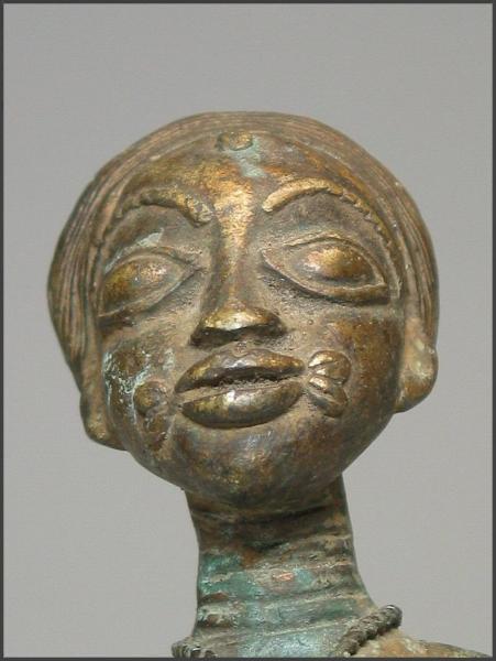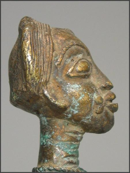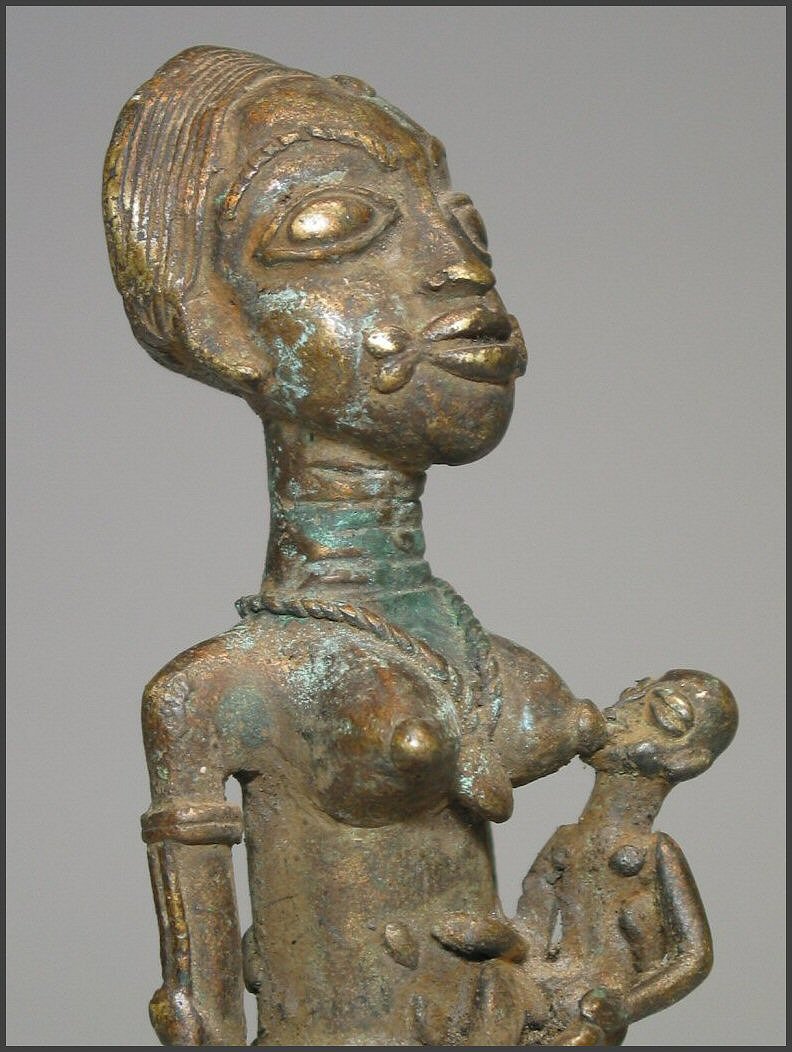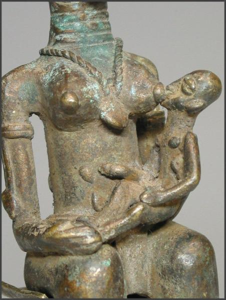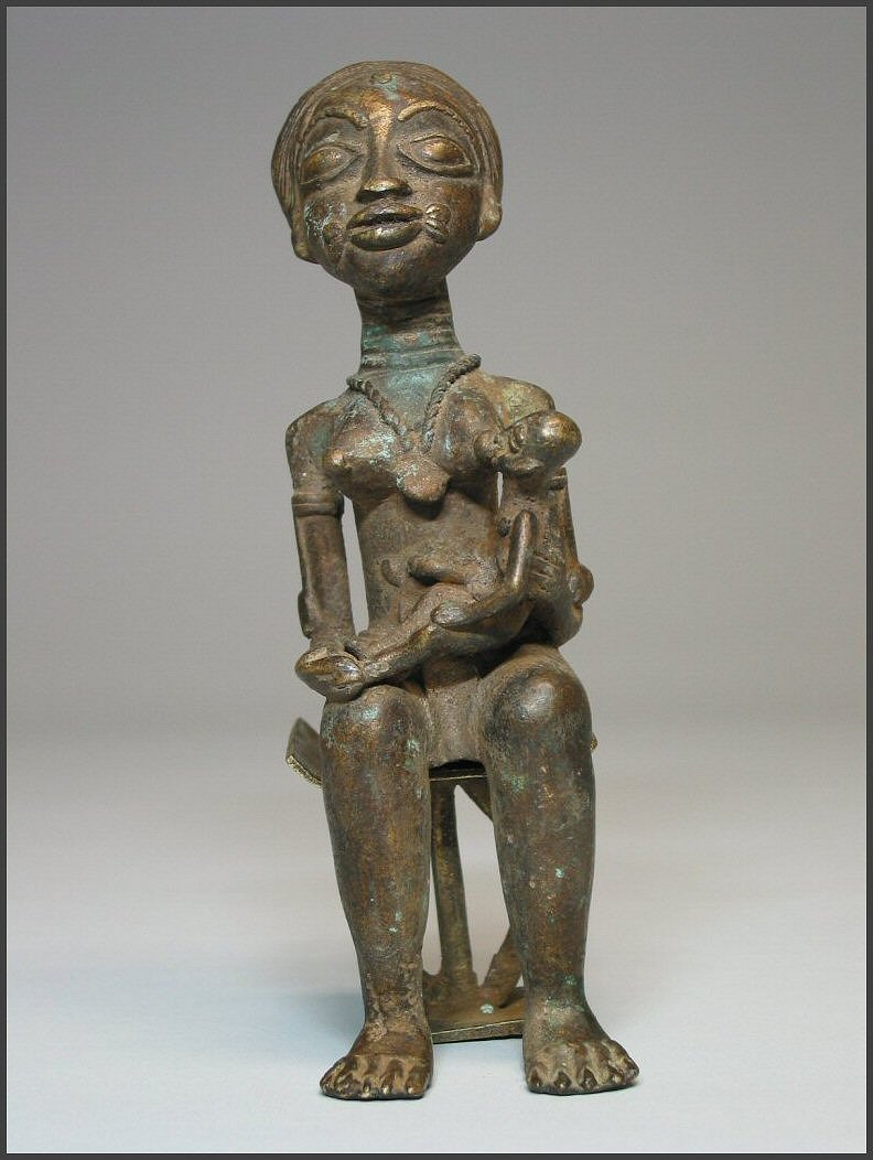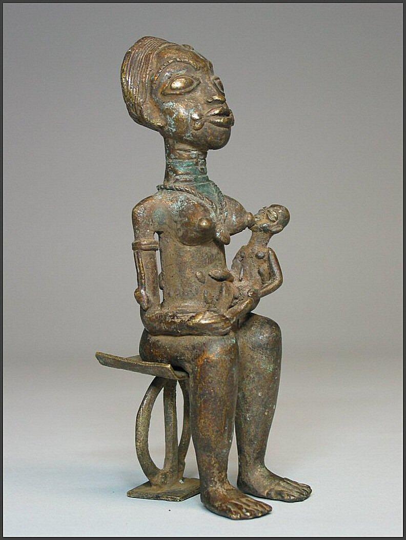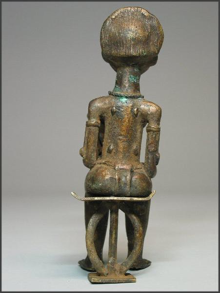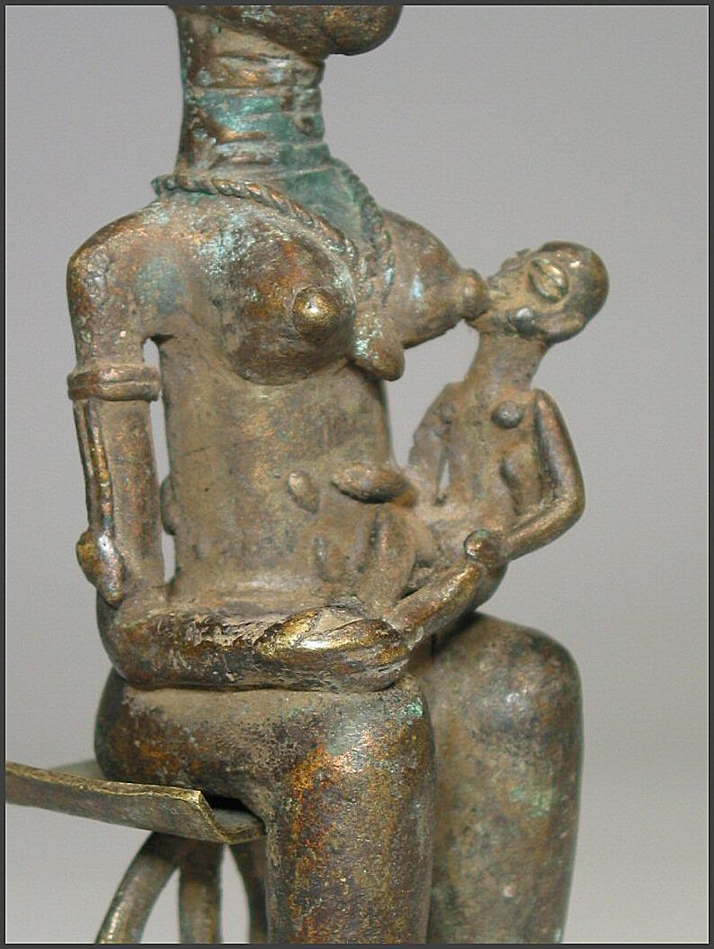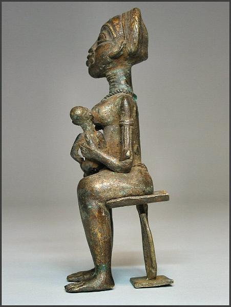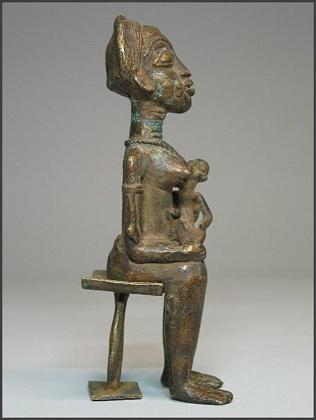 | A nice brass Akan or Ashanti maternity figure from Ghana (no longer in my collection) 9" tall I normally stay away from metal objects for some reason, but I really thought this little maternity figure was beautiful when I laid eyes on it. The figure is in 2 pieces, the stool and then the figure itself. This is my latest addition to my small but growing collection of African maternity figures. |