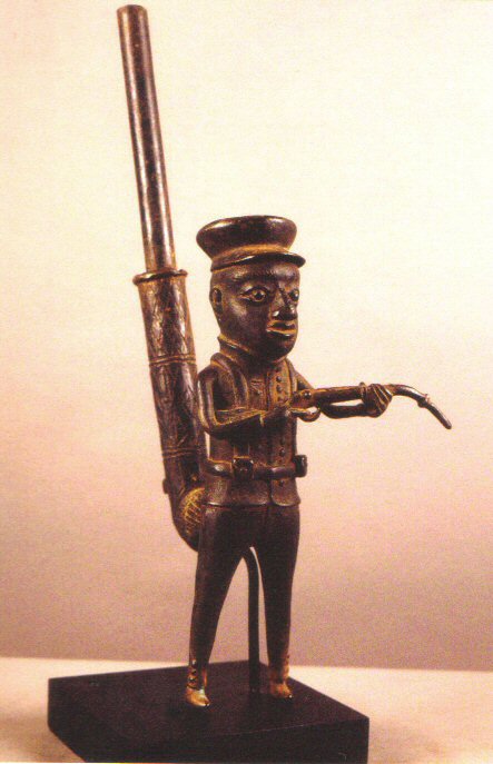 | Pipe in form of German Soldier, bronze, 19" Bamum. Cameroon A fine lost-wax casting of a colonial German soldier shown with buttoned uniform, belt, ammunition boxes and a rifle. The cap of the figure opens into a pipe, the stem of which is patterned in interlocking lines. German occupation of the Cameroon grassfields lasted from 1902-15, at which time this casting was probably made. |