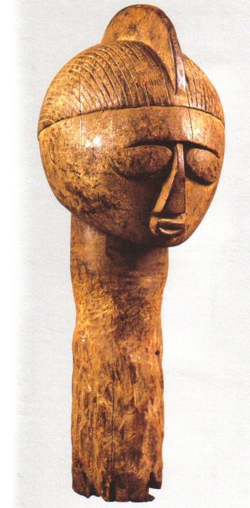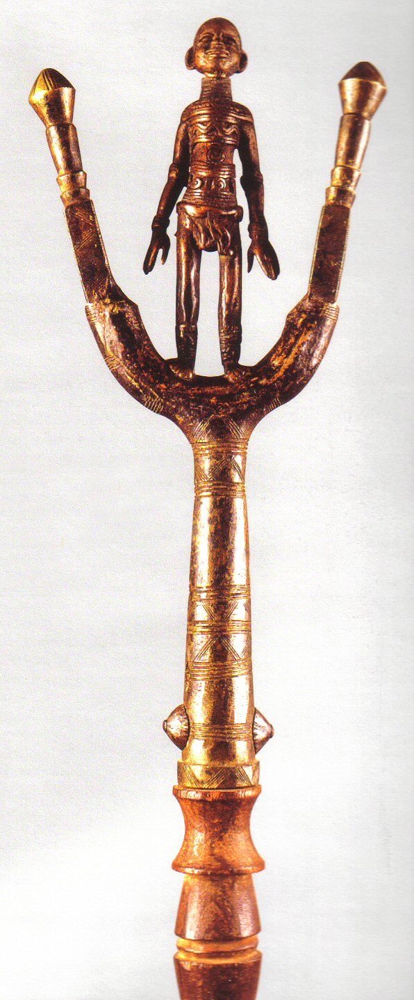 | Plate 53 Lightning Staff with Female Figure, bronze, 58" Mossi, Burkina Faso Staff finials were part of the regalia carried by blacksmiths and religious leaders. The images at the top served as insignia for each leader within a hierarchical society. (Roy, C- in Staffs of Life) |