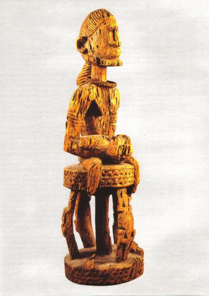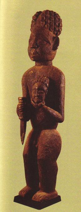 | Plate 27 Bahouang (Bamileke Style) Royal figure, 39" Grassfields, Cameroon Memorial sculpture of a deceased ruler, shown with a knife in one hand and the head of an ancestor in the other. The headgear replicates the knobbed cloth cap worn by royalty. A covered niche carved in the back of the figure held powerful ingredients. The figure has an encrusted black surface. The figure probably marked the passing of a chieftancy from one generation to the next. |