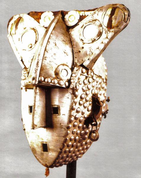 | Djankouran Koun Mask, metal-covered, 18" Malinke, Guinea Used by age-grade associations, this rare metal-covered mask replicates a type usually made of cloth, leaves and raffia. The mirrored circles at the top symbolize eyes. The mask thereby has the ability to seek out witches and sorcerers. (Imperato, R pc 5/16/96) |