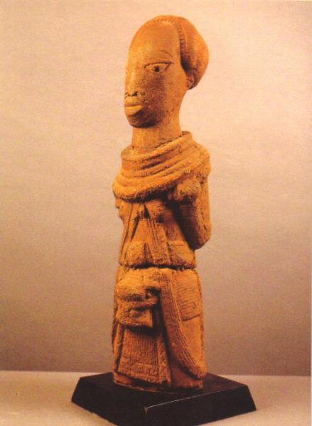 | Female Figure, 36" Nok culture, Nigeria The accouterments depicted on this figure replicate crafts such as beading, textiles and metalwork, all of which were practiced at the time this figure was made. Elaborate regalia is indicative of the high status of an individual. Figures from this culture have been dated from c. 500 BC to 500 AD. |