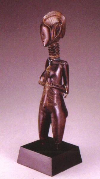 | Female Figure, 15" Temne, Sierra Leone This idealized figure is similar to another in the British Museum, collected about 1900 (Ravenhill: "A 'Temne' Figure"), placing its cultural use to approximately the 1850's. Both figures, along with eleven others, have been attributed to the same artist working out of the Temne, Sherbro, Mende complex in the mid-1800's. The ringed neck, classic pose, coiffure and body scarification mark this figure as an initiated, mature woman. |