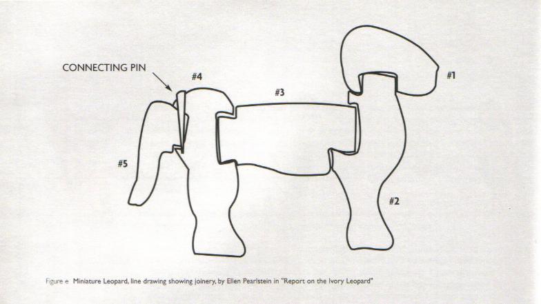 | From the Kingdom of Benin comes a rare ivory carving of a leopard. This miniature (4 1/2" long) is one of two known examples, the other of which is in the New Orleans Museum of Art. Both are believed to have been models for the large pair of ivory leopards given to Queen Victoria in 1897. That large pair, now in the British Museum, was constructed in a manner similar to this miniature leopard. Expert comparison of construction techniques for the large and small leopards produced the following observations: "The large leopard examined was constructed of five sections that are identical to the sections of the small leopard.. .Assembly is also achieved with ivory tangs and copper assembly pins ... The small ivory leopard was manufactured using sophisticated joining techniques that compare favorably to those used for the large leopards." A drawing of the construction of the small leopard (below) illustrates that each of the tangs fit into an adjoining section of the body, thus securing the parts. A connecting pin inserted down through its rump prevents the tail from coming loose. There was no practical need for such elaborate construction in a small object that could easily have been carved of a single piece of ivory. Piecing this object made sense if it were required to work out the problems associated with the larger leopards that, of necessity, had to be carved in pieces. Since the small leopard is so finely finished, with both copper and incised spots, it may also have acted as a presentation piece or gift. |