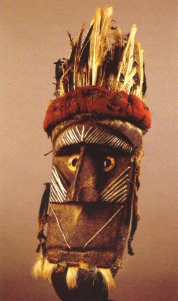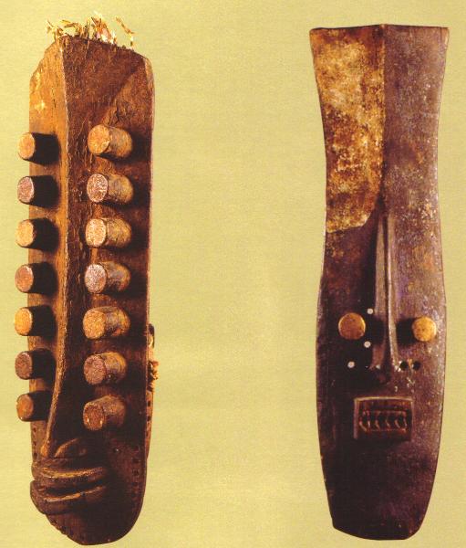 | Plate 15 Vertical Mask with 14 'eyes,' 22" Oubi/Grebo complex, Ivory Coast Seven pairs of solid, tubular eyes flank the median strip of this vertical mask. Actual viewing holes are pierced through the wood in a pattern on either side of the nose. A projecting mouth and a swelling at the forehead complete the mask's carved features. The eyes are pigmented with alternating white and red colors. Remains of feather quills may be seen at the top of the mask, and rim holes around the lower third served to hold raffia costume elements. This mask compares with the 12-eyed one in the Musee des Arts d'Afrique et d'Oceanie in Paris, alternately referred to as Grebo, Oubi or Kru. |