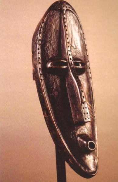 | Plate 20 Lozenge-shaped Mask, 15 1/4" MaHongwe (Kota), Gabon A sub-group of the Kota, the MaHongwe created wood masks that bore "strong resemblances to metal covered reliquary figures. These masks were apparently danced in some way." {Siroto, L. "Face of the Bwira" A/Horn Arts 1:3, p. 86) |