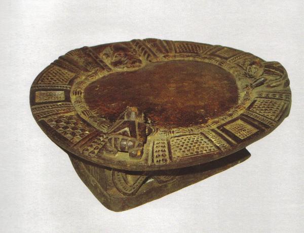 | Plate 24 Ifa Divination Tray, 12 3/4" diameter. Yoruba, Nigeria The head of Eshu dominates this circular board. The square, geometric patterning around the outer rim is interrupted by two kneeling figures making obeisance (dobale) to the Orisa. (Drewal, H. pc 4/1 1/00) Diviners who used such trays directed the carver in their making. |