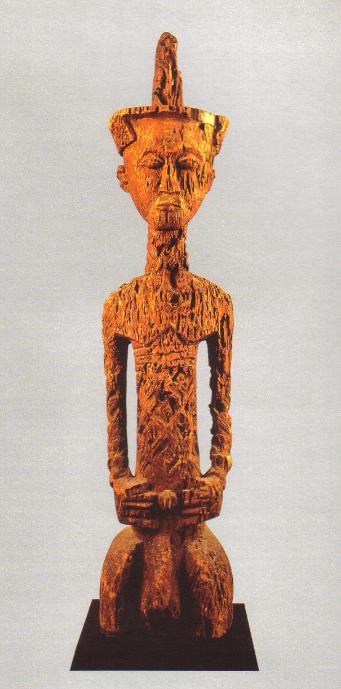 | Plate 28 Male Royal Figure, 48" Dengese, Rep. of Congo In the Dengese culture, sculptures were carved for both male and female ancestors.This rare, royal figure, isikimanji, represents the power of kingship, passed to a new king upon his ascension. The protective gesture of the hands framing center of his body implies guardianship. Intricately carved patterning once covered the entire torso of the figure. The conical headdress is a sign of the highest status, thought to signify power and secrecy. A similar sculpture is found in the collection of the Royal Museum for Central Africa,Tervuren, Belgium. |