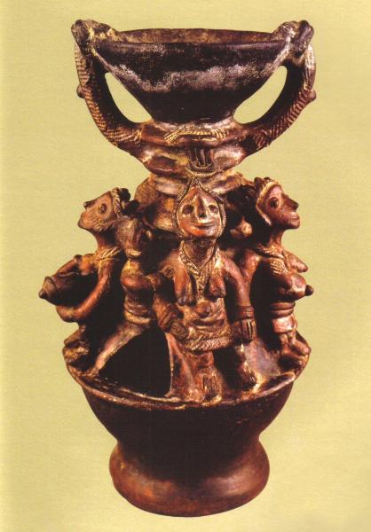 | Plate 33 - Oil lamp with multiple figures, 16", Baatombu (Bariba), Republic of Benin Among the Baatomba, the creation of pottery is the province of the women, who make both utilitarian and ritual forms. This oil lamp shows an array of female figures including a mother cradling her baby. Such lamps were commissioned for diviners or funerary rites. |