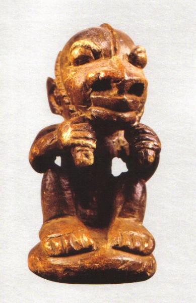 | Plate 35 Male Figure (nomoli), hands on beard, 7" Sape Confederation, Sierra Leone Steatite figures are found buried in the ground by farmers clearing land for new crops. Called nomoli by the Mende, they are placed in shrines and believed to be good omens. Holes in each ear of this figure connect, inside the head, with nostril holes and an opening in the top of the head. |