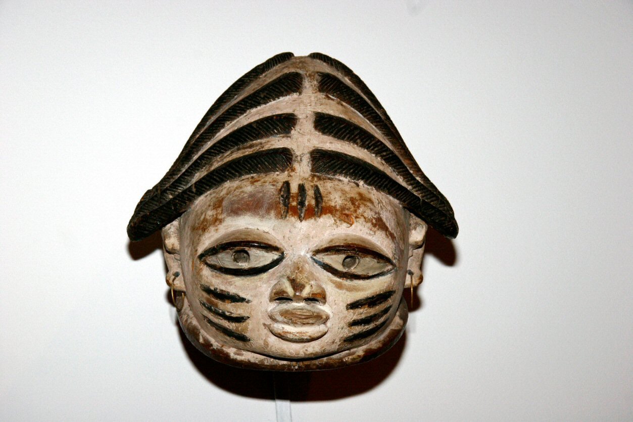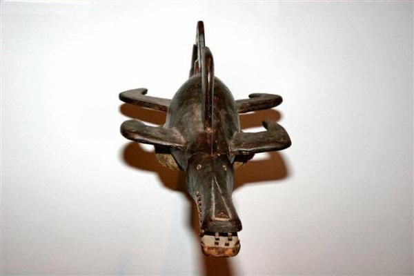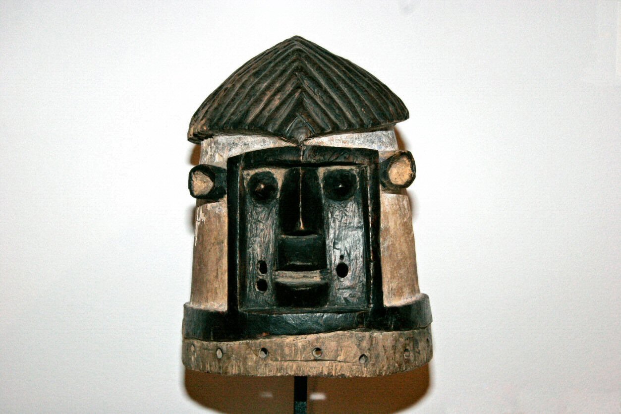 | Gonde Mask, 15" Mende, Sierra Leone When a Sande mask became old and eroded, it was sometimes reinvented as Gonde, a character in the coterie of festival dances. Where Sande is sedate and correct, Gonde is the reverse, irreverent and irrascible. The mask is often spotted or painted, contrasting it with the sleek black of the Sande mask. |