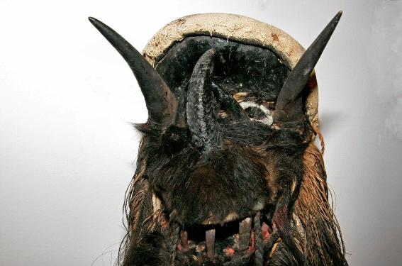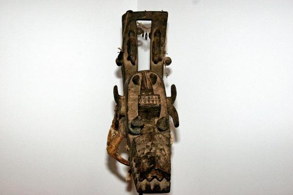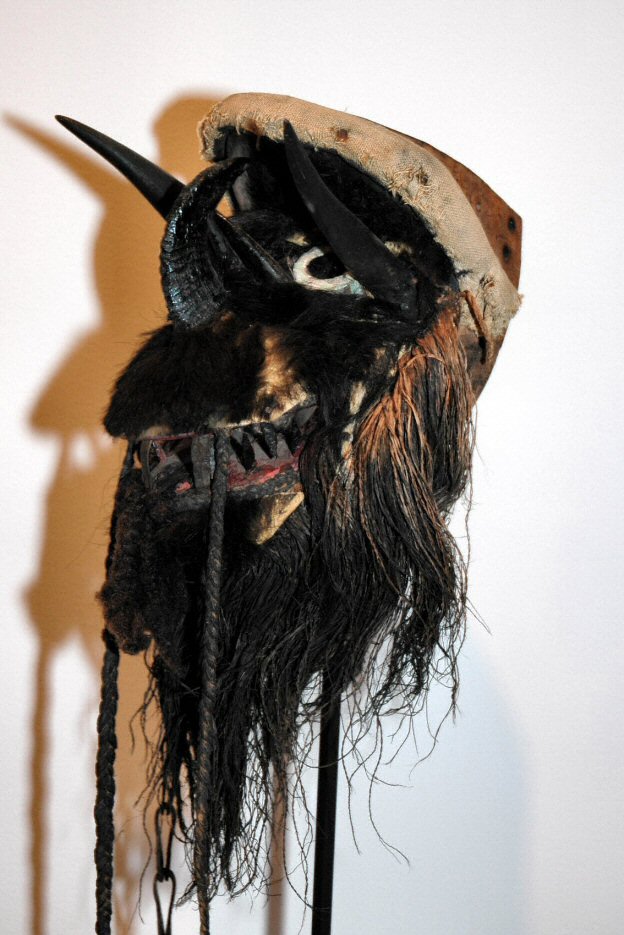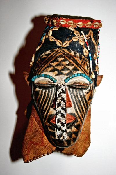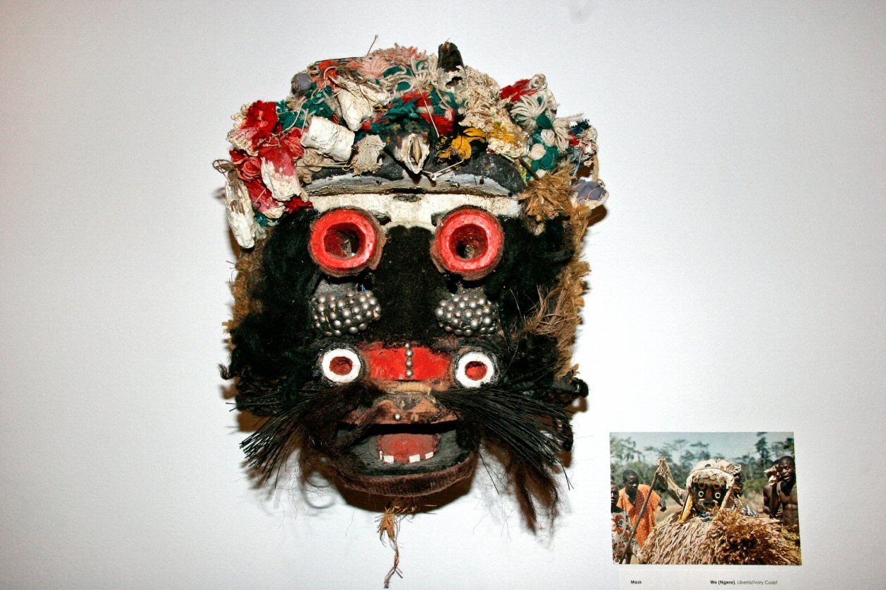 | Mask with multiple materials, 18" Ngere (We), Liberia/Ivory Coast Such masks are worn as part of a costume that includes a body cover of raffia strips. Gela masqueraders are male members of lineages who support and sponsor masquerade festivals for funerals and harvest celebrations. Lineage elders commissioned and owned regalia, including masks. This mask has been carved with tubular eyes, then pierced with viewing holes on either side of the nose to allow the dancer to see. Added materials include fur, raffia and upholstery tacks. |